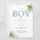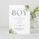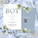 Convite de chá de bebê menino com uma elegante tipografia azul-acinzentada e folhagem botânica verde, e seu código QR no verso. Concebido por Thisisnotme