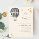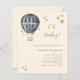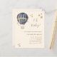 Um balão de ar azul e dourado com estrelas douradas. Convite de chá de bebê em estilo vintage celebrando um menino. Texto: Oh Bebê! Fundo bege. Personalize e adicione um nome e detalhes da festa.