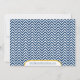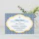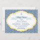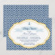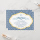 Este convite de chá de bebê 5x7 tem um tema náutico. No fundo, há um padrão de zigue-zague em chevron azul marinho e branco com uma moldura curva dourada e branca no meio. No topo, há uma âncora de barco azul marinho dentro de uma corda branca redonda. Abaixo, Chá de Bebê está escrito em uma fonte cursiva em um banner azul suave. Abaixo, você pode personalizar todas as informações do chá de bebê. Copyright GraphicMarket