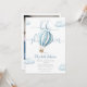 Este encantador convite de chá de bebê apresenta um fofo balão de ar quente azul e nuvens, juntamente com uma tipografia elegante. Com o código QR do seu registro e foto especial no verso. Criado por Thisisnotme©