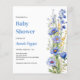 Um fundo branco elegante. Decorado com flores silvestres em azul e amarelo. Personalize e adicione o nome da futura mamãe e detalhes da festa.