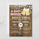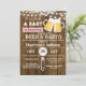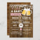 Convite de chá de bebê masculino com tema de cerveja e churrasco em fundo de madeira rústica.