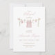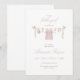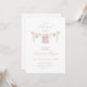 Um convite de chá de bebê em aquarela suave e feminino, apresentando roupas de bebê rosa penduradas em um varal de corda. Este design editável é perfeito para celebrar uma doce menina com um toque quente e elegante. Ideal para chás de bebê modernos ou com estilo vintage.