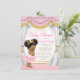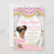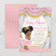 Convites de chá de bebê princesa rosa e dourado com uma linda princesa afro-americana étnica dançarina de balé usando um lindo tutu rosa, colar de pérolas e linda coroa dourada em um belo fundo de cortina rosa e dourado. Esses belos convites de chá de bebê afro-americanos rosa e dourado são facilmente personalizados para o seu evento, basta adicionar seus detalhes no estilo de fonte que preferir.