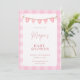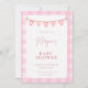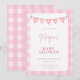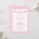 Celebre a chegada iminente com este convite de chá de bebê doce e charmoso. Com um fundo xadrez rosa suave e uma adorável faixa de bandeirinhas com corações e padrões, este convite cria um ambiente perfeitamente aconchegante e acolhedor para um chá de bebê de menina.