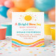 Um convite de chá de bebê moderno e alegre com uma ilustração de sol limpa e cores vibrantes e alegres. Projetado com tons amarelos quentes, rosa coral e azul-turquesa aqua, este convite é perfeito para chás de bebê modernos e neutros em termos de gênero.