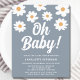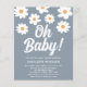 Você está planejando o chá de fraldas de um menino? Este chá de fraldas do orçamento é decorado com margaridas desenhadas à mão e Oh Baby! em tipografia retrô branca num fundo azul. Facilmente personalizável. Desenho original © Michele Davies.