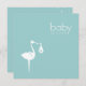 Modelo de convite de Chá de fraldas personalizável com ilustração fofa de uma cegonha estilizada dando um bebê e chovendo pequenos corações em azul-aqua pálido. Personalize-o com suas próprias informações ou clique em "Personalizá-lo" se você precisar alterar a cor de fundo e o tamanho/fontes do texto ou escolher um tamanho de convite diferente.