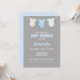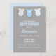 Convite para Chás de fraldas em um esquema de cores azul e cinza, com ilustração de roupas de bebê em uma linha de clothesline. Esta design é perfeita para uma celebração do Chá de fraldas Boy.