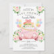 Dirigir por design de chá de fraldas com um carro cor-de-rosa com presentes, balões e buquê de flor azul bonito. Sacudir o nosso convite para ver uma floral coordenada de volta para um toque especial extra.