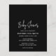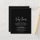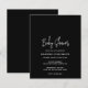 Convite de chá de fraldas de orçamento preto moderno com um simples design com o título do evento em uma tipografia de script elegante e seus detalhes de evento em uma fonte de sans serif minimalista. Este convite para chás de fraldas chic é neutro em relação ao sexo, fazer perfeito se você está tendo um bebê ou uma menina.