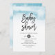 Convite moderno para chá de fraldas de garoto chic com fundo de aquarela e script em negrito.