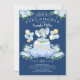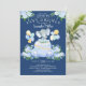 Dirigir por design de chá de fraldas com um elefante giro, carro azul com presentes, balões e buquê de flor azul bonito. Sacudir o nosso convite para ver uma floral coordenada de volta para um toque especial extra.