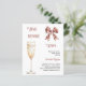 Um convite moderno, elegante e sofisticado para um chá de noiva Vino before Vows. Fundo branco com laço rosa, taça com bolhas e pérolas. O nome é escrito com uma fonte moderna de letra manual. Personalize e adicione os detalhes da sua festa.