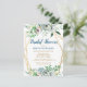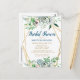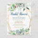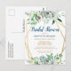 Flores suaves em azul, rosa e branco em aquarela boho dentro de uma moldura geométrica dupla dourada apresentam detalhes botânicos e de frutas. Personalize este cartão postal de convite de chá de noiva com suas próprias cores e fontes ou mantenha esta tipografia popular como está para sua conveniência.