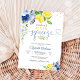 Celebre o amor e a amizade com este elegante convite de chá de noiva floral de limão. Com limões pintados à aguarela, fatias de limão e delicadas flores azuis e brancas com acentos dourados, este design combina charme rústico com sofisticação moderna. Perfeito para homenagear a noiva, este convite personalizável define o tom para uma reunião alegre. Personalize com detalhes do evento para criar um souvenir que os convidados irão valorizar.