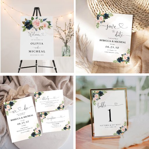 Convite de Chá de Noiva Floral Rosa e Azul Marinho