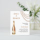 Um convite moderno, sofisticado e glamouroso para um Chá de Noiva Pérolas e Prosecco. Fundo branco com um colar de pérolas e uma garrafa dourada de Prosecco. O nome é escrito com uma fonte moderna de letra manual. Personalize e adicione os detalhes da sua festa.