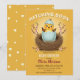 Convite de chabá de bebê adorável com um lindo pintinho amarelo saindo de uma casca de ovo azul em um ninho aconchegante, cercado por delicadas flores cor-de-rosa da primavera.