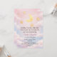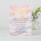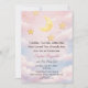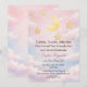 Celebre um doce sonho sob a lua e as estrelas. Este convite de chá de bebê em aquarela apresenta uma lua crescente brilhante, detalhes dourados em forma de estrelas e nuvens cor de rosa para um tema celestial romântico.