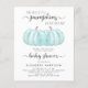 Um convite de chá de bebê virtual de gêmeos fofo, alegre e econômico com "Duas Pequenas Abóboras Doces Estão a Caminho" escrito em uma mistura de tipografia cinza suave e caligrafia estilosa, e uma aquarela azul pastel de uma abóbora. Personalize o nome da mãe e os detalhes do chá em tipografia cinza simples.
