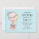 Convite de churrasco de bebê com um design adorável com uma ilustração de aquarela. Um balão de ar quente decorado com lindas flores vermelhas e rosas. Um adorável ursinho branco sentado na cesta. Fundo azul claro estilo vintage.