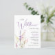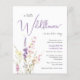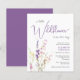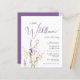 Um convite de churrasco de bebê de menina elegante e econômico que apresenta "uma pequena flor silvestre está a caminho" em uma mistura de tipografia cinza suave moderna e uma caligrafia roxa estilosa, e um buquê de aquarela inspirado em boho de delicadas flores silvestres roxas, rosa e amarelas.