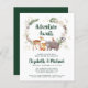 Convite de churrasco de bebê de casal rústico econômico fofo com ilustrações de aquarela de animais da floresta, flores, folhagens e estrelas douradas e flocos de neve. "Aventura Aguarda" e os nomes dos futuros pais estão escritos em um script verde floresta.