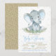 Convite de churrasco de bebê elefante menino com adorável elefante bebê com folhagens em um fundo de glitter dourado. Este convite de churrasco de bebê elefante é facilmente personalizado para o seu evento. Você pode remover o fundo de glitter na parte traseira e adicionar a cor de sua escolha.