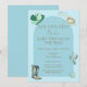 Com um design moderno e cores suaves. Este convite de churrasco de bebê com tema "Não é o Nosso Primeiro Rodeio" em azul pode ser personalizado com os detalhes do seu evento especial, com um fundo azul claro no verso. Criado por CelebrateWithInk