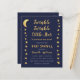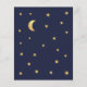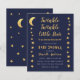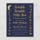 Um convite de chá de bebê econômico com estrelas douradas e lua nas bordas esquerda e direita. Tem fundo azul-marinho. O texto é amarelo-dourado e branco. O título "Twinkle Twinkle Little Star" e o nome estão escritos em uma caligrafia dourada, com estrelinhas no i das palavras "Twinkle".