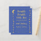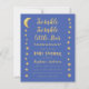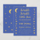 Um convite de churrasco de bebê econômico com estrelas douradas e lua nas bordas esquerda e direita. Tem fundo azul. O texto é amarelo dourado. O título "Twinkle Twinkle Little Star" e o nome são escritos em uma fonte manuscrita dourada, com estrelinhas no i das palavras "Twinkle". No verso, há apenas estrelas e a lua.