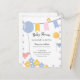 Cores pastéis de amarelo, azul e rosa para um chá de bebê neutro. Banderines, passarinhos fofos, flores e balões enquadram a escrita e fonte moderna simples para um convite fácil de personalizar.