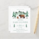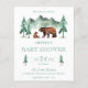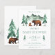 Um convite de churrasco de bebê neutro em relação ao sexo. Em um fundo branco, é mostrada uma imagem em aquarela de uma mãe e um bebê urso cercados por árvores da floresta verde. O texto da tipografia lê-se Churrasco de Bebê Seu Nome. Personalize adicionando todos os detalhes do evento e informações de contato.