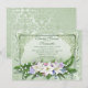 Comece seu chá de noiva moderno e elegante com o nosso convite de chá de noiva floral com lírios brancos vintage tendência, apresentando lírios brancos elegantes com flores de ervilha doce e violetas com folhas verdes sobre um fundo de damasco verde com efeito ombre suave com uma moldura ornamentada e sofisticada. Basta personalizar o nosso lindo convite de chá de noiva com as informações do seu chá de noiva e você estará pronta. ©Delightful Doodles