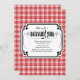Um convite fácil de personalizar! O padrão de piquenique branco e vermelho é o pano de fundo para este design de tendência. O painel de cobertura é pré-impresso com as palavras "junte-se a nós para um churrasco de quintal". Basta adicionar suas informações personalizadas.O cartão é fácil de personalizar com seu texto, fonte, cor da fonte e escolha de seis tipos de papel.