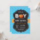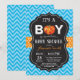 Cartão de Convite de Chuvada de Bebê Abóbora Outono com chevron azul, laranja e fundo de quadro-negro. Para personalização adicional, clique no botão "Personalize" e use nossa ferramenta de design para modificar este modelo.