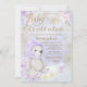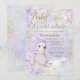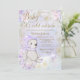 Convite de chuvada de bebê girl baby it's cold outside com adorável ursinho em um lindo fundo floral de flocos de neve roxo pastel. Este convite de chuvada de bebê de urso roxo é facilmente personalizado para o seu evento, basta adicionar seus detalhes. O texto Baby it's cold outside não pode ser alterado.