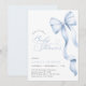 Este convite elegante apresenta um charmoso laço azul claro e uma escrita romântica à mão, perfeito para uma chuvada de bebê menino caprichosa. O laço chique e o design elegante adicionam um toque de sofisticação, enquanto o modelo editável permite uma fácil personalização. Crie um convite lindo e memorável para o seu evento especial.