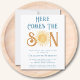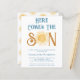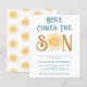 Convide familiares e amigos para a chuvada de bebê do seu menino com este convite de chuvada de bebê econômico temático de sol. Ele apresenta o texto "Aqui Está o Filho" em tipografia retrô azul com um sol em aquarela. O verso é decorado com um padrão de sol. Fácil de personalizar. Aquarela Original © Michele Davies.