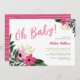 Design moderno e tendência de convite de chuvada de bebê com uma borda floral tropical ousada e fonte de caligrafia estilosa. Personalize o design com os detalhes da sua festa de chuvada de bebê com espaço em branco no verso para adicionar fotos ou texto adicional. Use as ferramentas de design para personalizar todas as fontes e cores do texto para criar um design único.