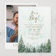 Este convite de chuvada de bebê rústico e elegante com floresta de pinheiro em aquarela pode ser personalizado com suas informações em tipografia moderna e uma foto especial no verso. Criado por Thisisnotme©