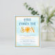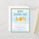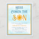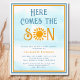 Convide familiares e amigos para a chuvada de bebê com tema solar com este convite de chuvada de bebê para menino econômico. Ele apresenta o texto "Aqui Vem o Filho" em tipografia retrô estilosa com um sol em aquarela amarela em um fundo de céu azul. Fácilmente personalizável. Como criamos nossas obras de arte, você não encontrará essa imagem exata de outros designers. Aquarela Original © Michele Davies.