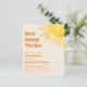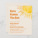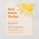 Este convite de chuveirinho de bebê orçamento é decorado com um sol amarelo pintado à mão e "Aqui Vem o Sol" em tipografia retrô estilosa em um fundo suave creme.