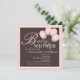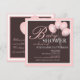 Um convite de chuveiro de bebê maravilhosamente elegante apresenta um lindo buquê de balões rosa em um rico fundo de marrom chocolate - perfeito para a moderna mamãe que está esperando uma menina. Um pequeno poema adorável no verso deixa claro para os convidados que todo esse rosa é para a bebê que está a caminho; "Fitas e laços, e cachinhos fofos. Estamos felizes em dizer, é uma doce bebê menina"