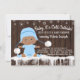 Convite de baby shower Baby it's cold outside com adorável menino étnico vestido com um bebê azul e chapéu de neve em um fundo rústico de madeira e flocos de neve. Esses convites de baby shower de flocos de neve de inverno para meninos são facilmente personalizados para o seu evento, basta adicionar seus detalhes.