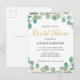 Este belo cartão postal de convite para chá de panela é decorado com folhas de eucalipto verde em aquarela e folhagens douradas.