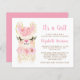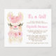 Convite de chuveiro virtual de menina bebê simples e fofo com ilustração em aquarela de uma linda lhama feminina com flores rosa e brilho dourado. "É uma menina!" e o nome da futura mãe estão em uma fonte rosa divertida e você pode personalizar os detalhes do chuveiro virtual em tipografia dourada.