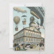 Ilustração vintage de viagem e transporte futurista de ficção científica com pessoas viajando de dirigíveis, balões de ar quente, um trem invertido e um automóvel conversível antigo em uma cena urbana retrô de metrópole vitoriana steampunk.
