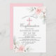 Design de buquê rústico floral simplesmente elegante em verde pastel de aquarela rosa-claro, rosas de folhas brancas/flores de cerejeira em fundo branco e letras cinzas escuras. Convites delicados de comunhão para menina. Cruz com diamante falso no meio.